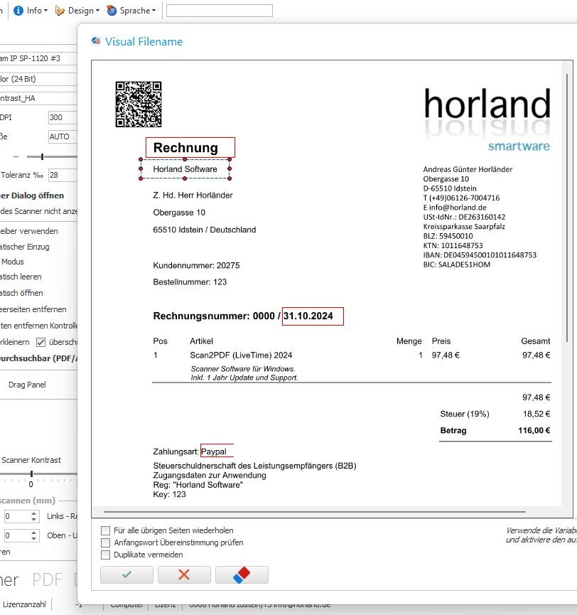Der neue virtuelle Dateiname ermöglicht erstmals die gezielte Auswahl einzelner Textbereiche. Die Reihenfolge der Auswahl bestimmt dabei den finalen Dateinamen. Einfach die gewünschten Textstellen mit einem Rahmen markieren – und der Dateiname wird automatisch erstellt.