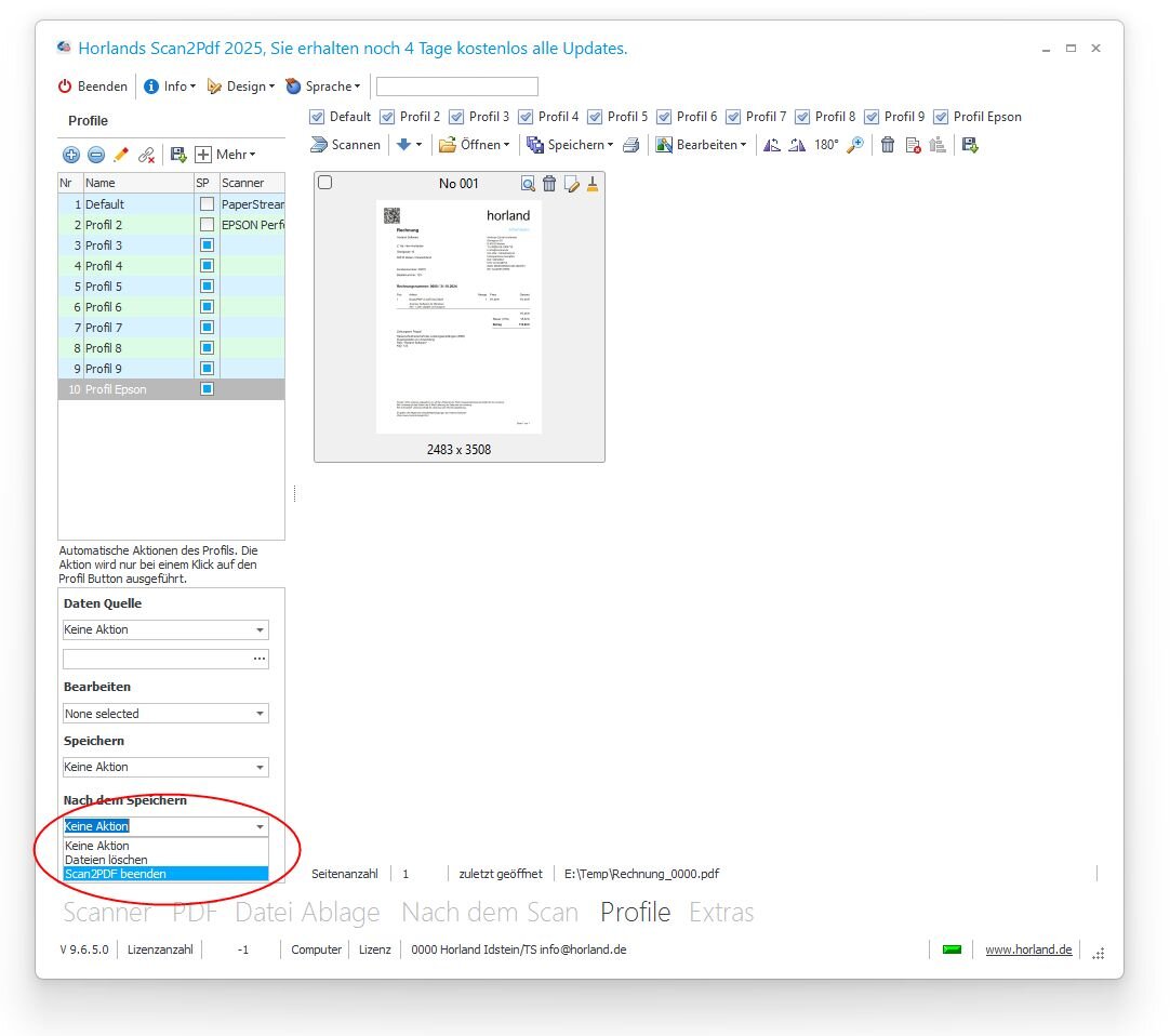 Die Profile wurden um die Funktion ‚Scan2PDF beenden‘ erweitert. Nach dem Speichern der PDF-Datei wird Scan2PDF automatisch geschlossen.