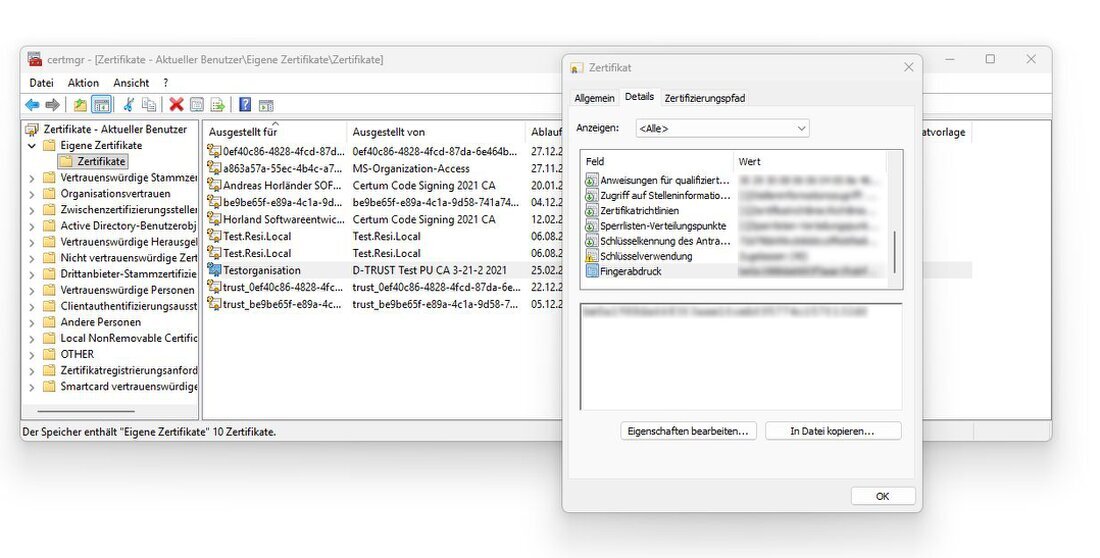 - Doppelklick auf Zertifikat → Details → Fingerabdruck → kopieren.
