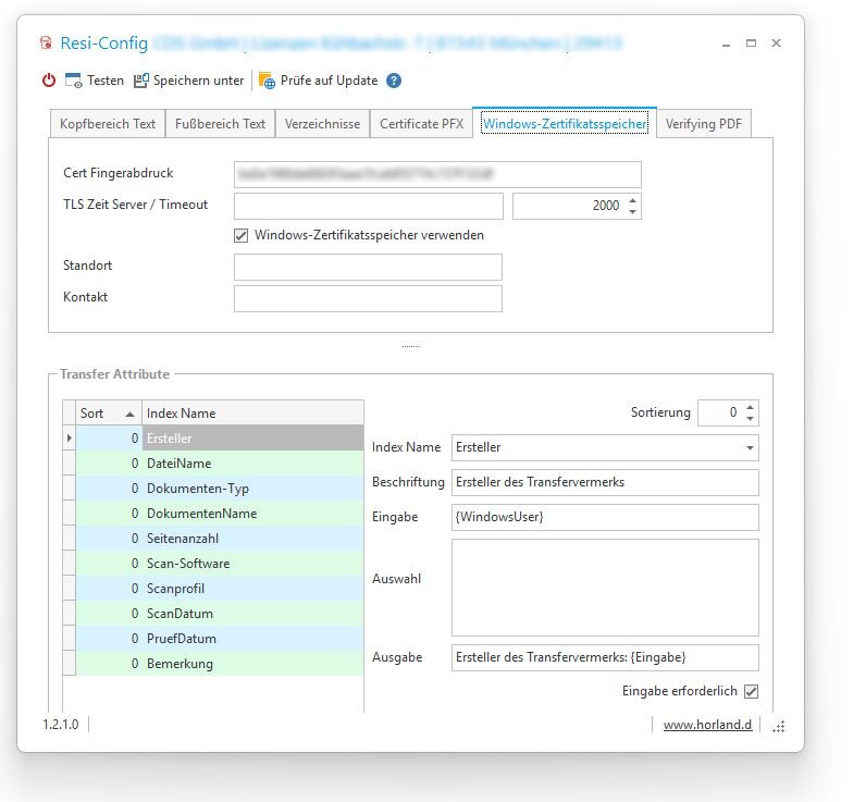 Das Zertifikat wird anhand seines SHA-1-Fingerabdrucks (Thumbprint) aus dem Zertifikatsspeicher CurrentUser\MY geladen.