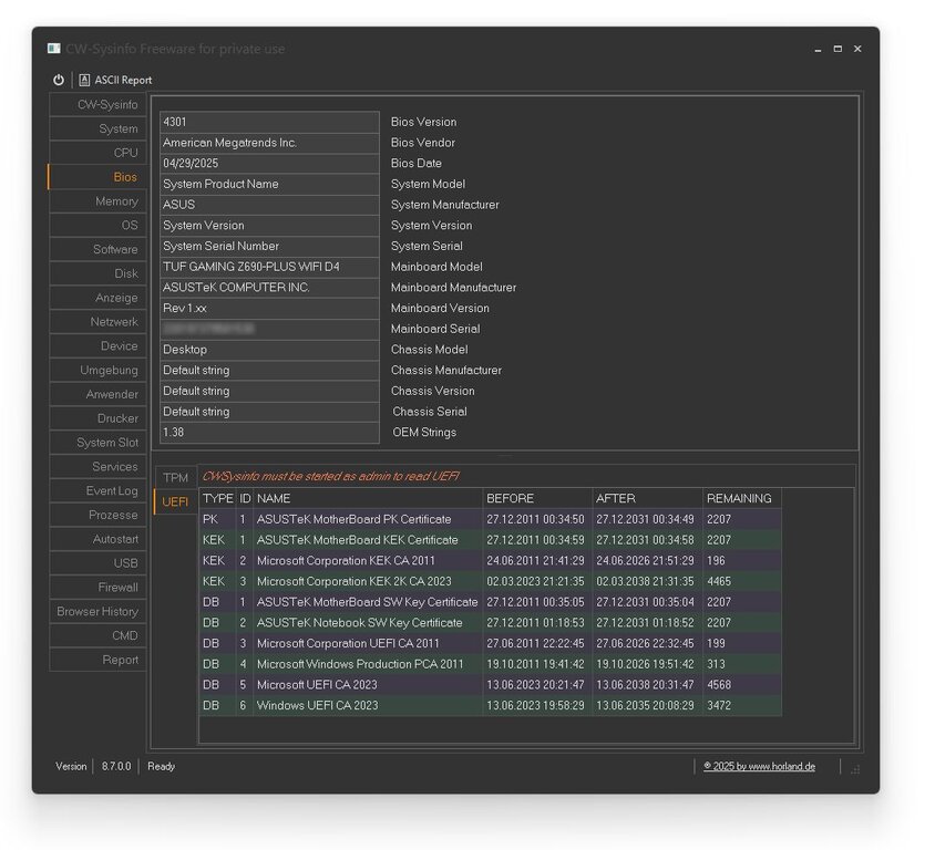CW-Sysinfo liest jetzt die wichtigsten SecureBoot-Zertifikate indirekt aus dem UEFI aus.